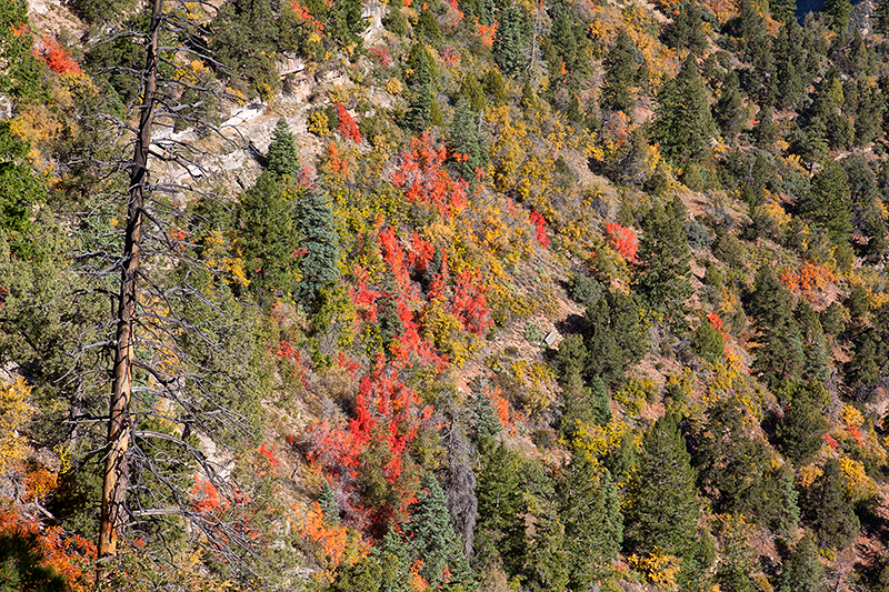 Mischwälder mit herrlich gelben Espen und wieder einigen dieser rotholzigen Nadelbäume, zusammen mit reichlich anderem Gehölz. Das alles